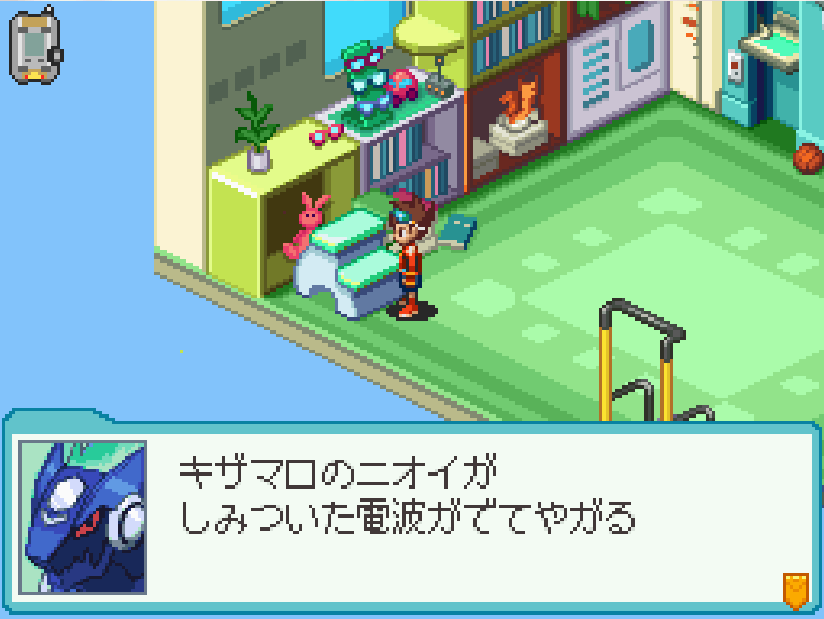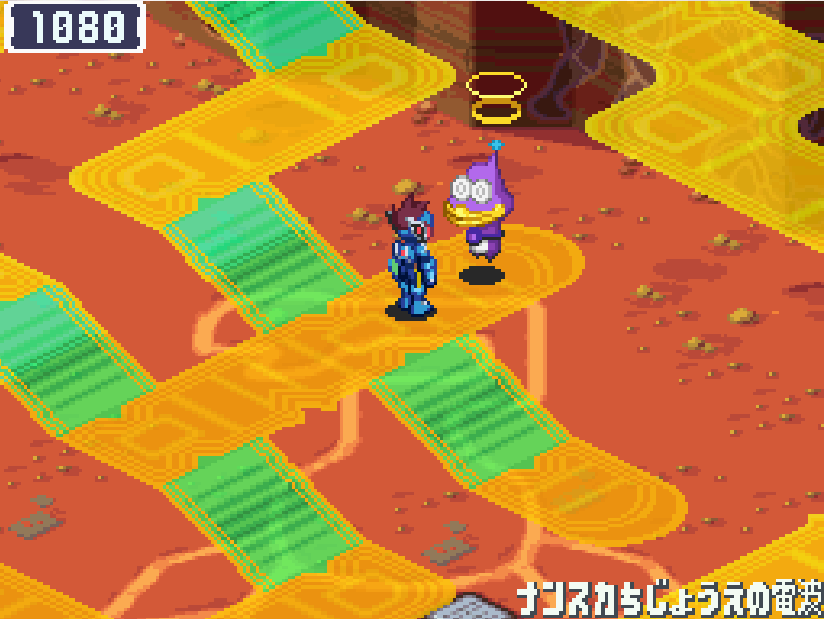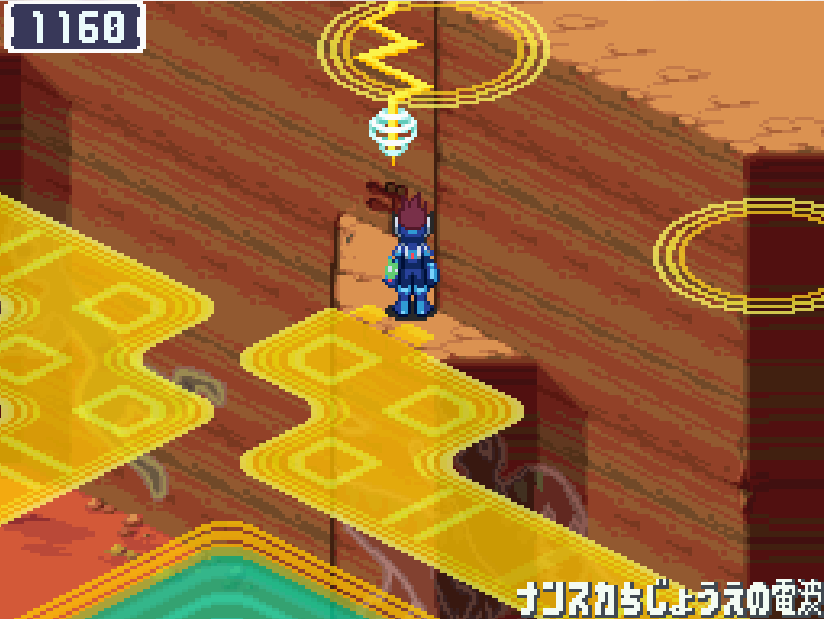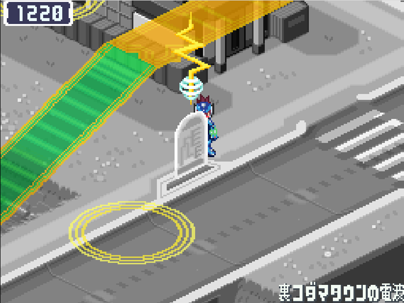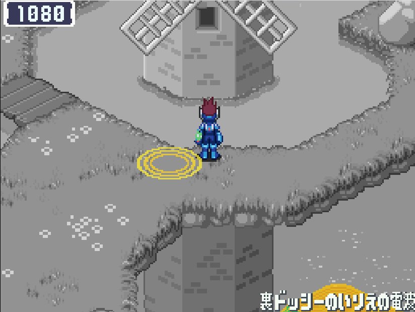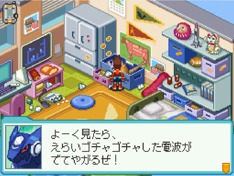 現実世界でゴン太の家の箱を調べる![]() 電波変換し、ごちゃごちゃハコの電波へ入る 下にある青色ミステリーウェーブを調べる