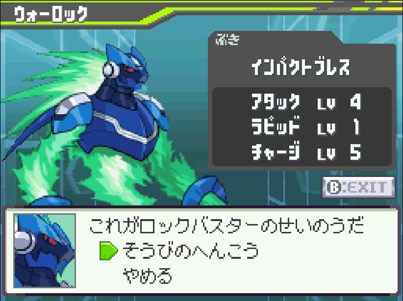 メニュー画面から「ロックマン」-「ウォーロック」を選択することで武器の装備を変えられます。