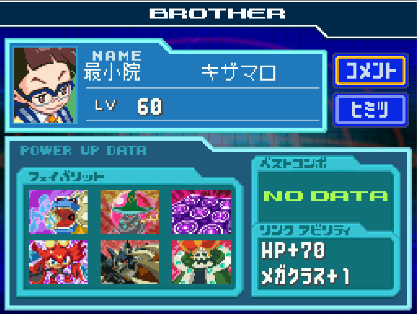 | 最小院 キザマロ | HP+0〜70 | メガクラス+1 | 本編クリア後に、ピアノの電脳の10連戦終了後 |